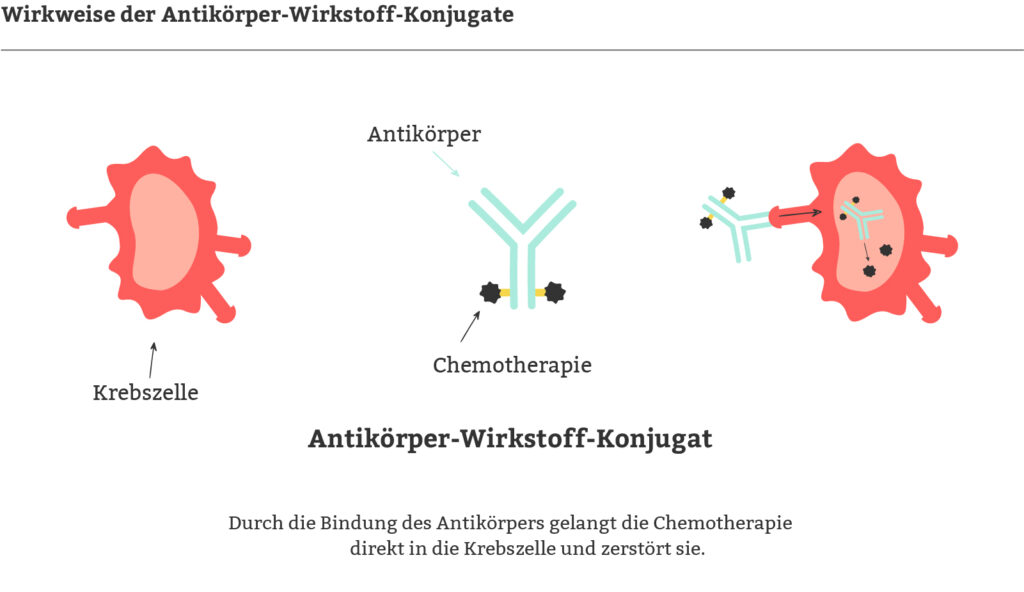 Antikörper-Wirkstoff-Konjugate (Antibody-Drug Conjugates, kurz ADCs) sind zielgerichtete Krebsmedikamente, die aus einem Antikörper, einem starken Zellgiftstoff (Wirkstoff) und einer Verbindung (Linker). Der Antikörper bindet sich an die Krebszelle, die dann das ADC aufnimmt. Im Zellinneren wird das Zellgift freigesetzt, das die Krebszelle zerstört, möglichst ohne gesunde Zellen zu schädigen.